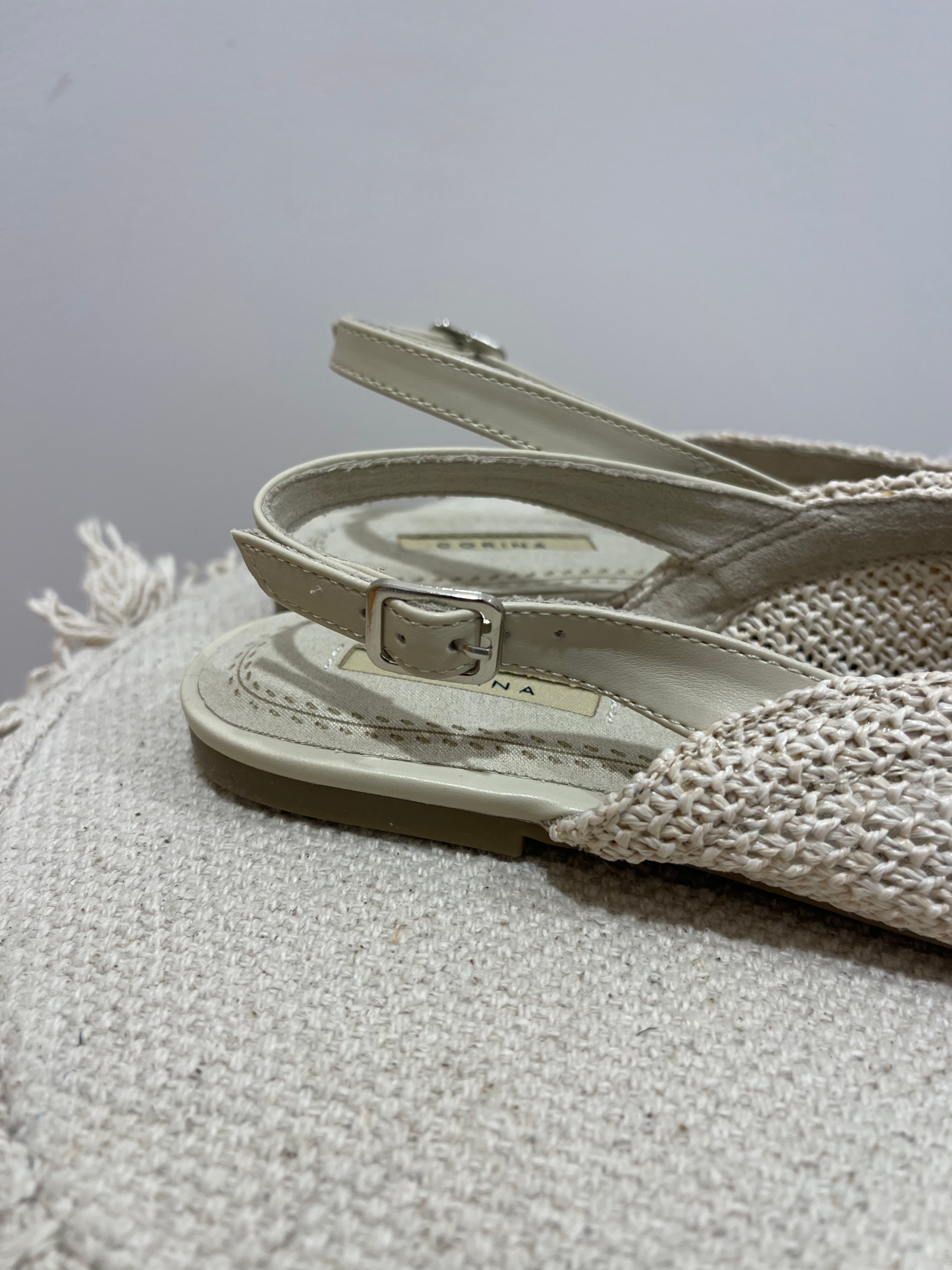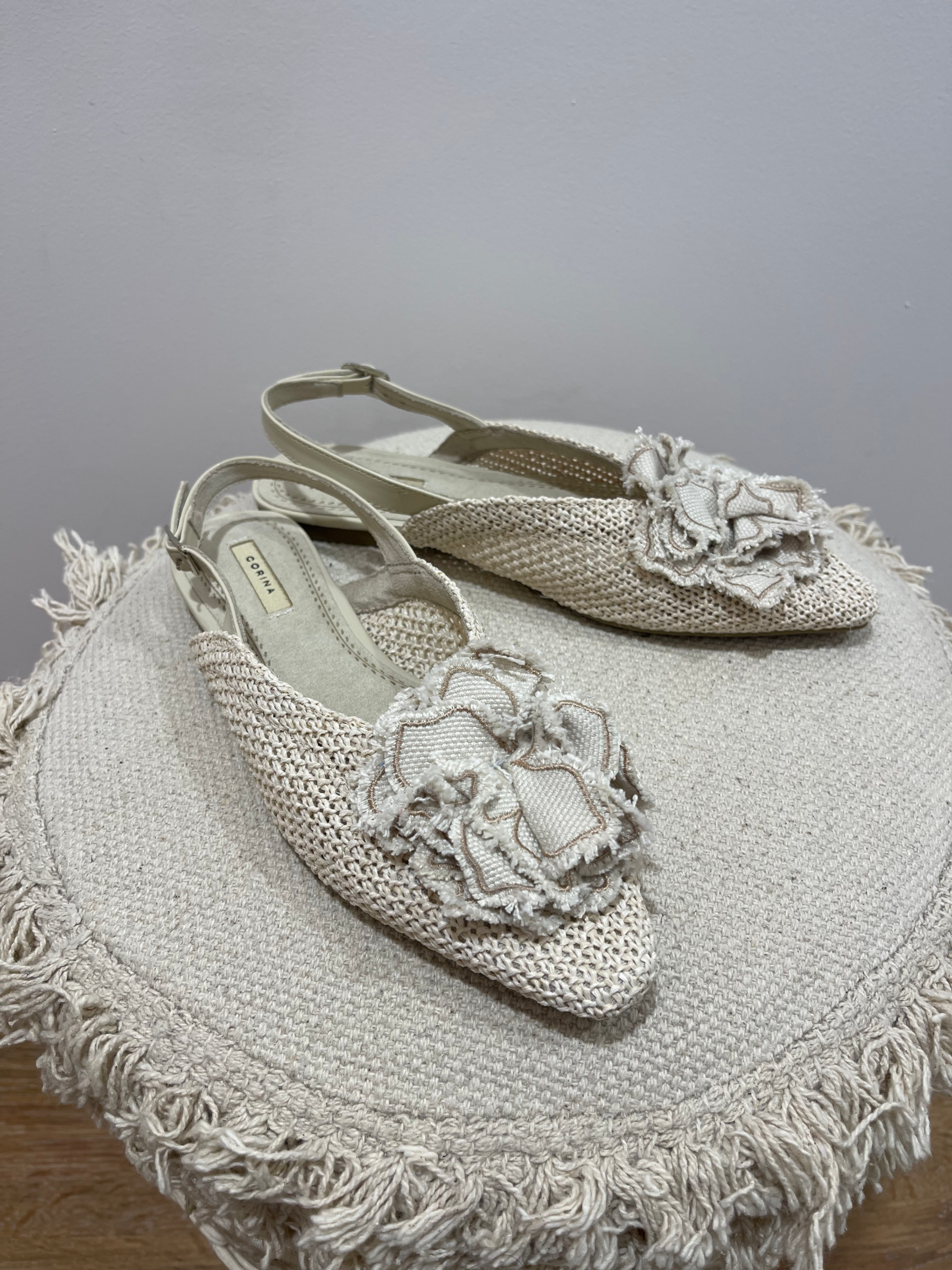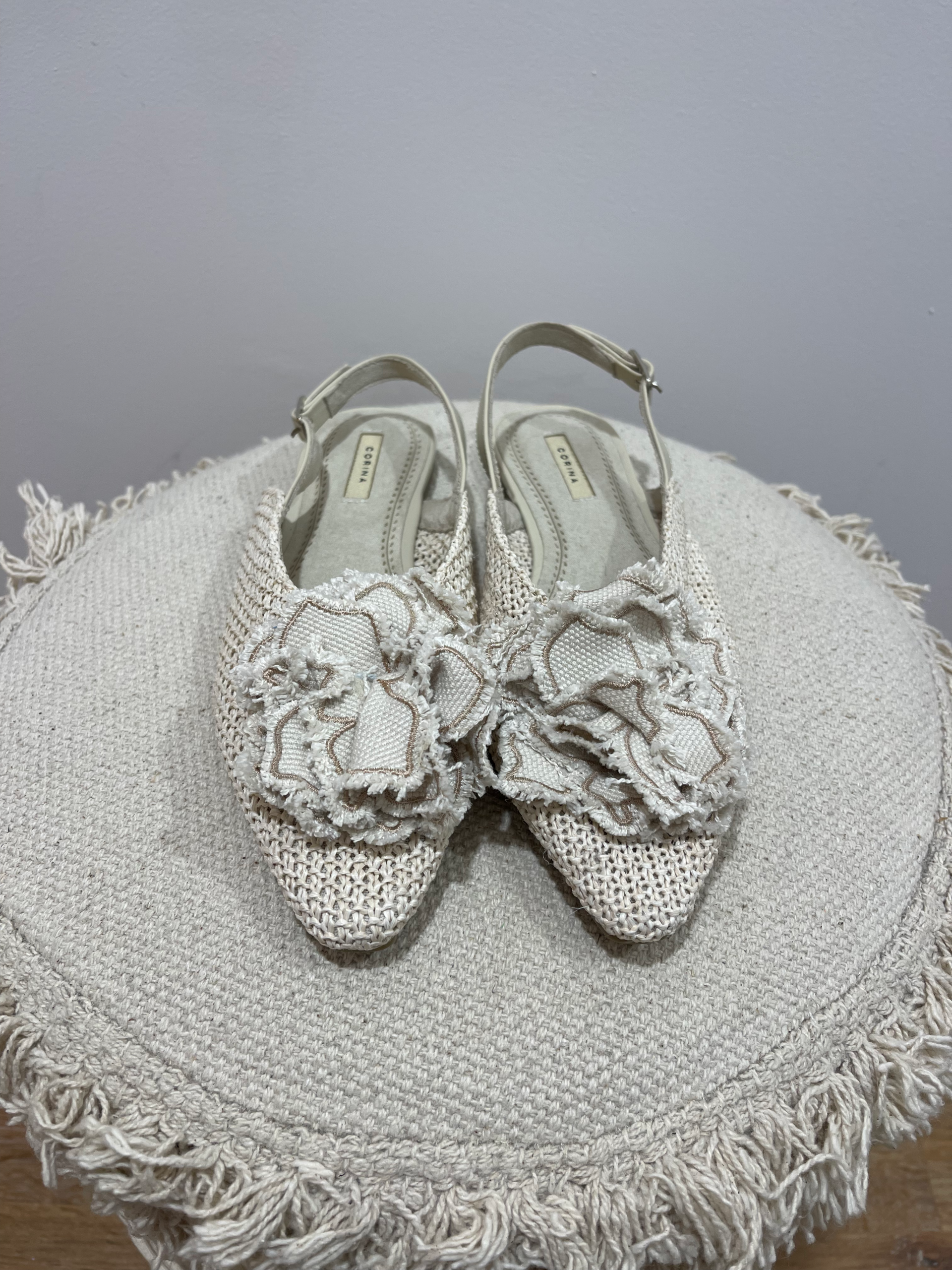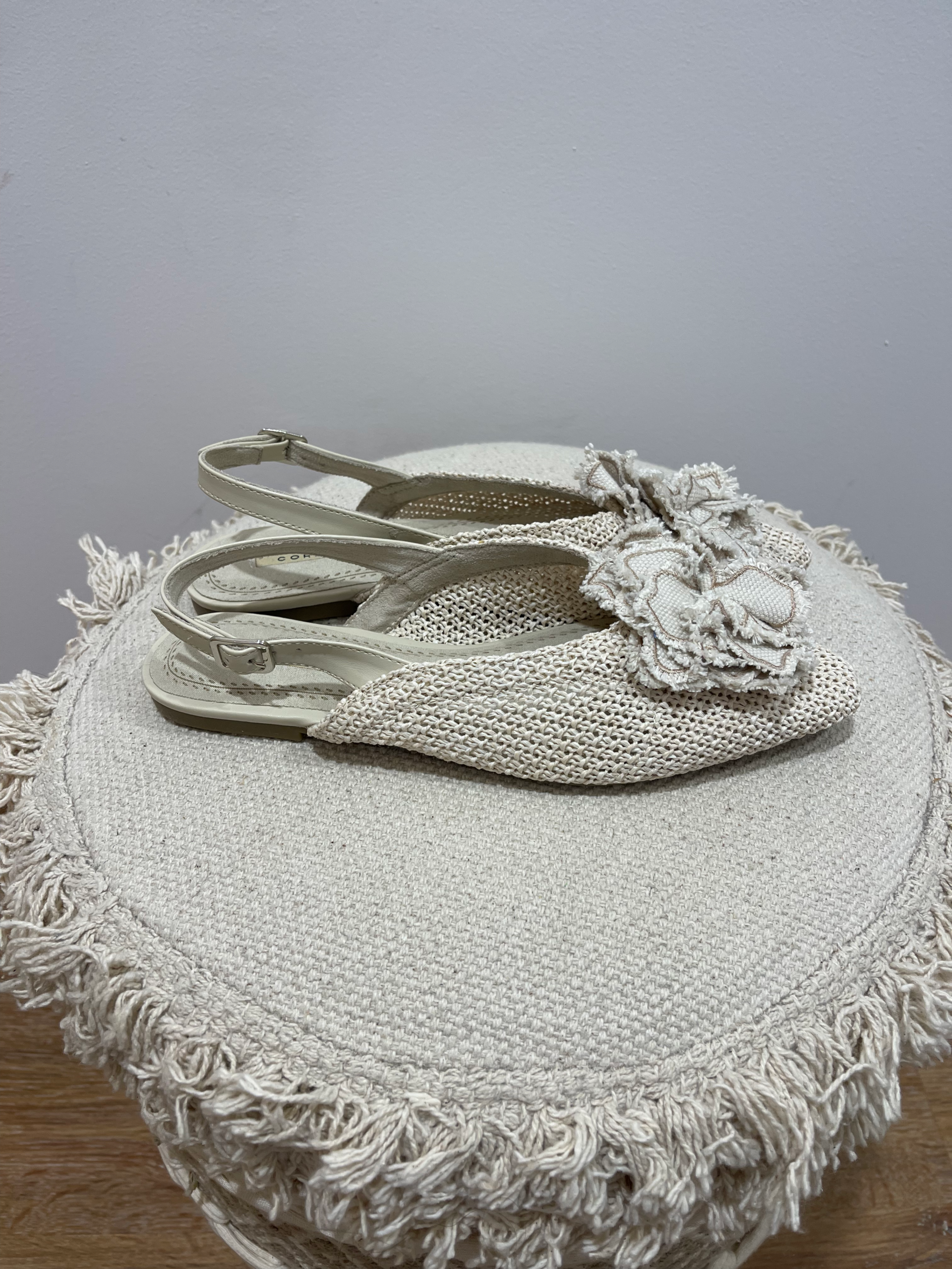 Zapato de crochet con flor decorativa, talón descubierto, y hebilla para atar.